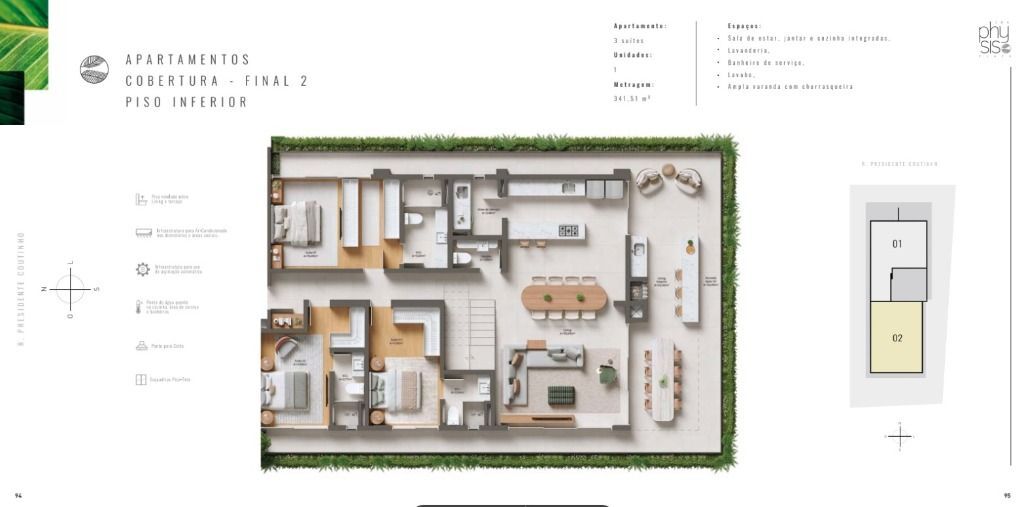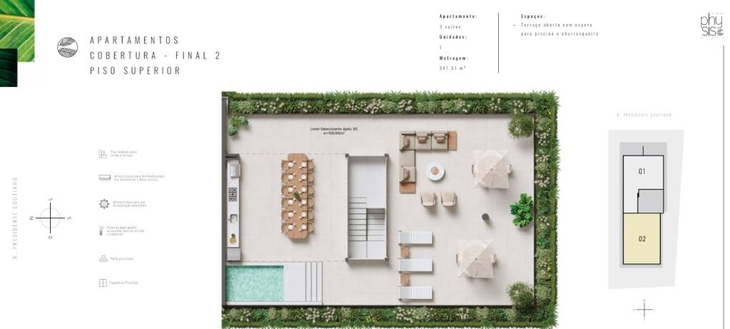 O Physis Place conta com ampla área de lazer, composta por piscinas, academia, sauna, áreas de descompressão, espaço natureza, pet place, espaço kids e salão de festa gourmet.