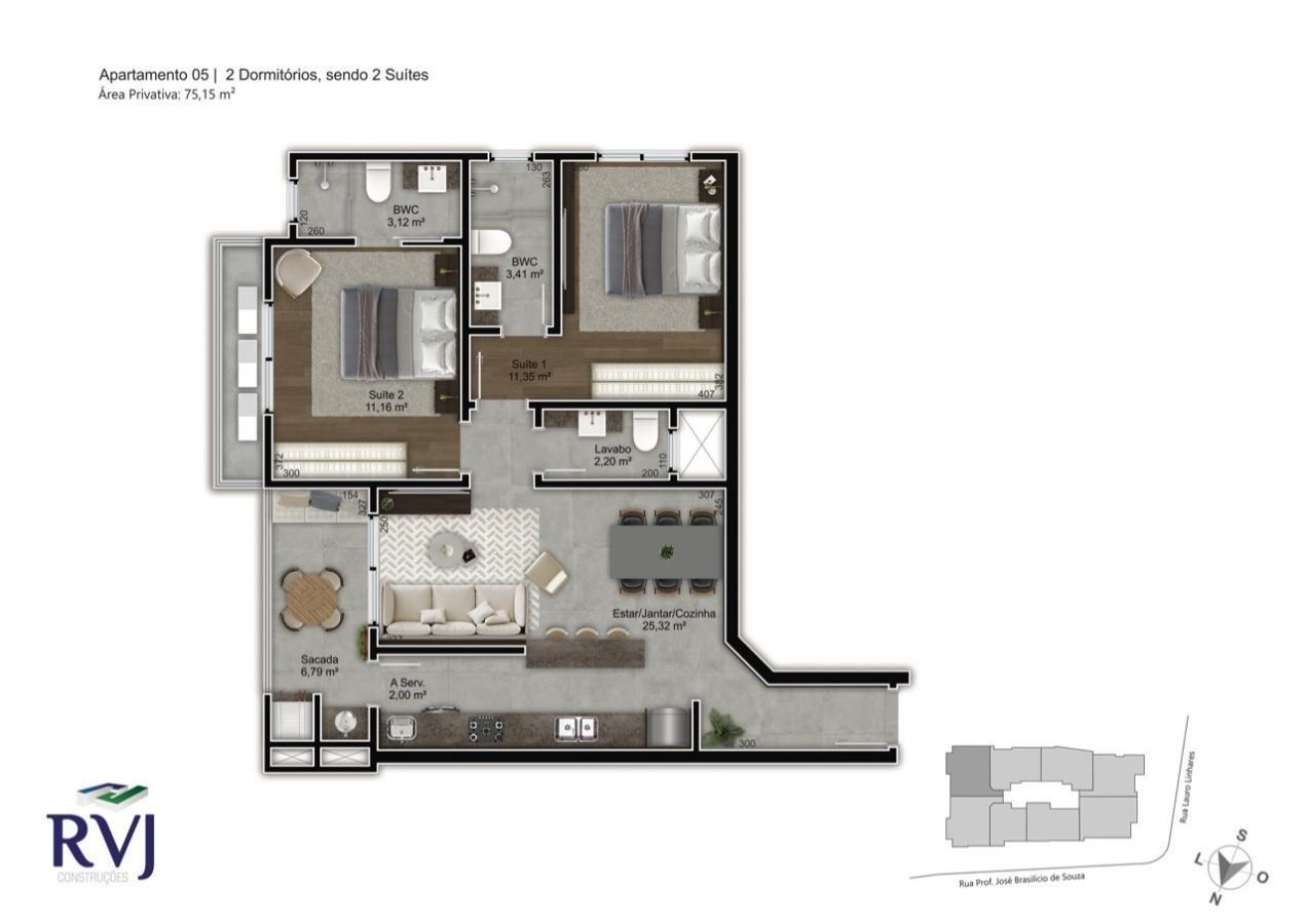 2 Dormitórios, sendo 2 Suítes3 Banheiros1 Vaga